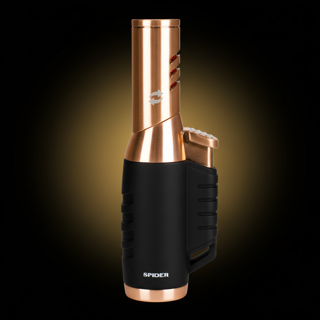 Discover the Spider SP-578 Refillable Butane Torch Lighter. Engineered with a unique 45° rotatable angle nozzle that allows you to direct the flame exactly where you need it.