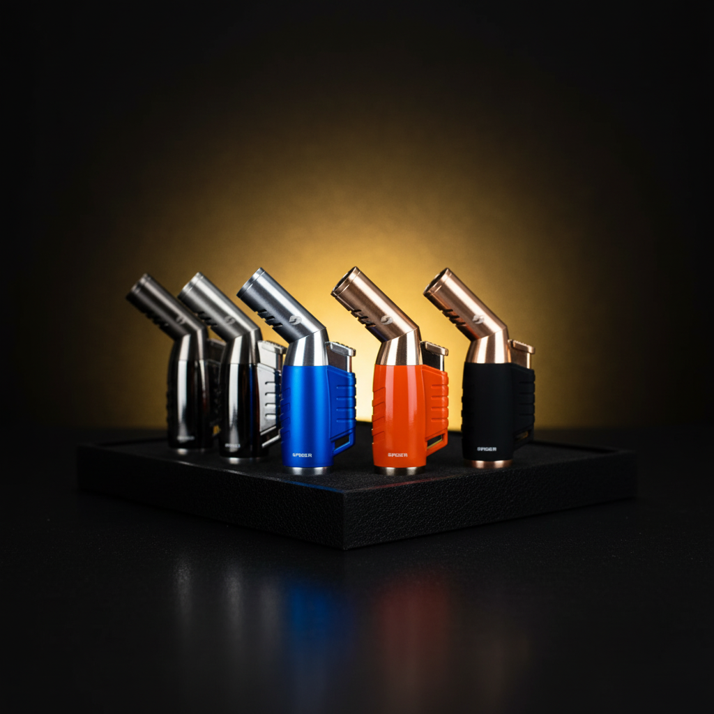 Discover the Spider SP-578 Refillable Butane Torch Lighter. Engineered with a unique 45° rotatable angle nozzle that allows you to direct the flame exactly where you need it.